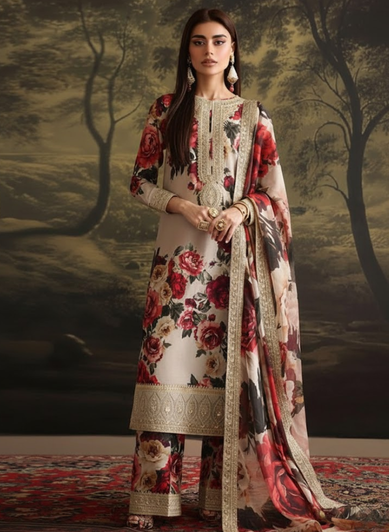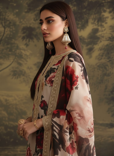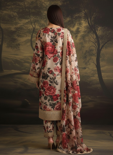 A breathtaking three-piece ensemble featuring a printed lawn shirt on a cream base, adorned with bold, vibrant crimson and tea-rose floral motifs.