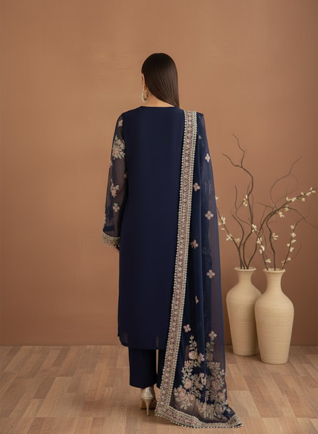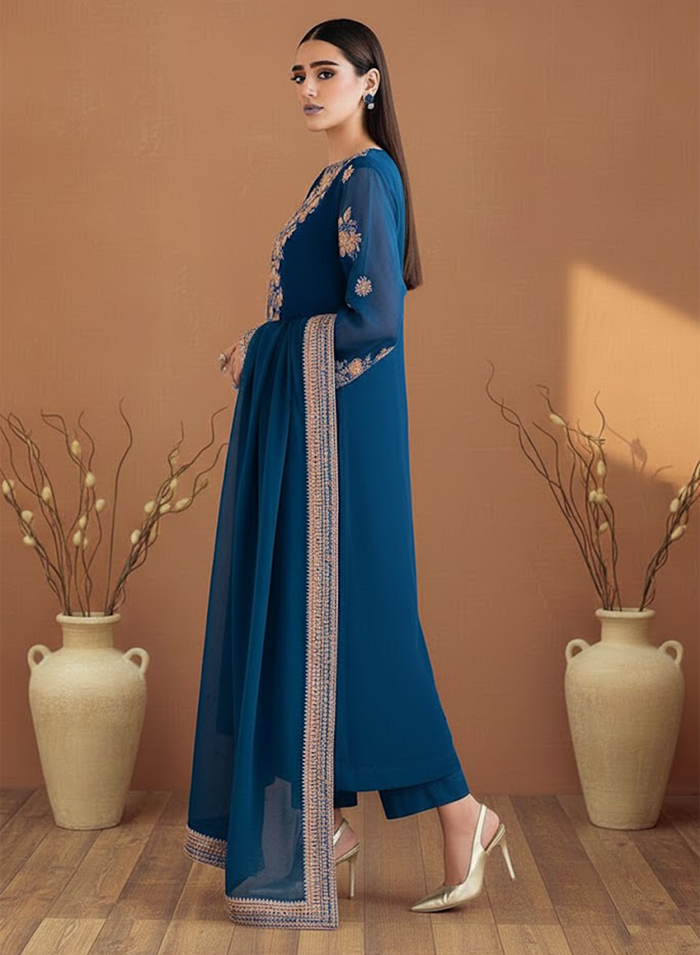 Luxury Sleeves: Designed with sheer, embroidered sleeves and detailed borders for a formal, sophisticated appearance.