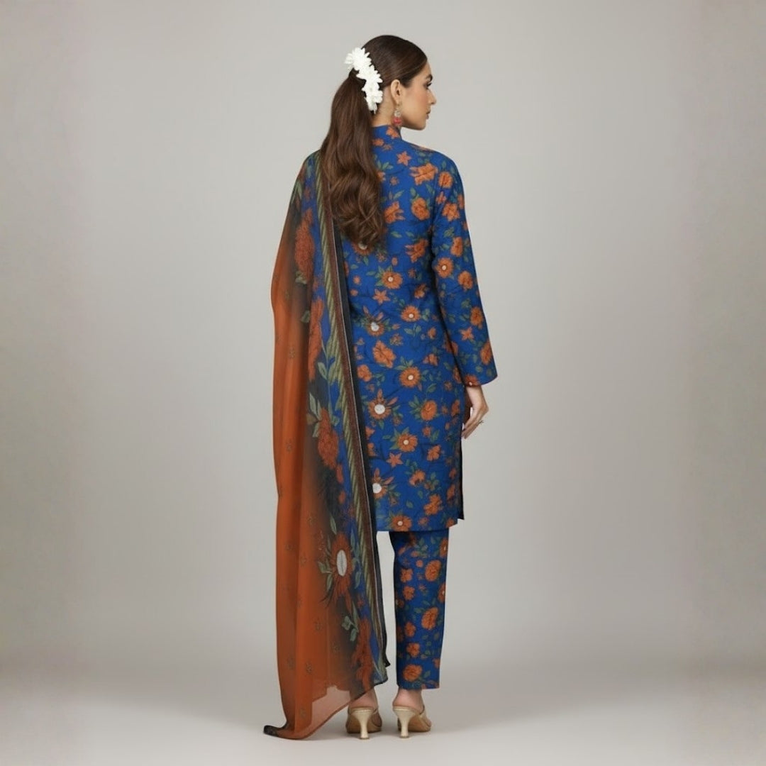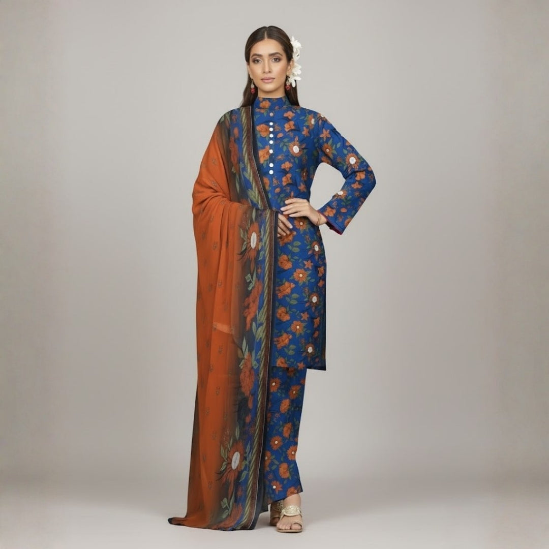 This striking three-piece ensemble features a printed lawn shirt in a vibrant cobalt blue base, accented by a contrasting marigold-orange and white floral pattern.
