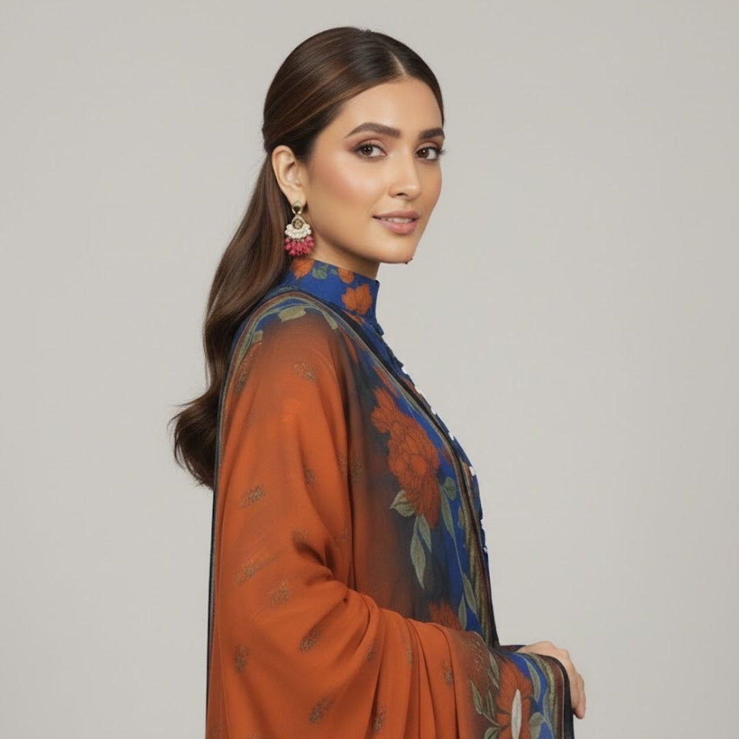 A bold chiffon dupatta in a deep sunset-orange hue with a detailed floral border completes the set, providing a vivid and elegant finish.