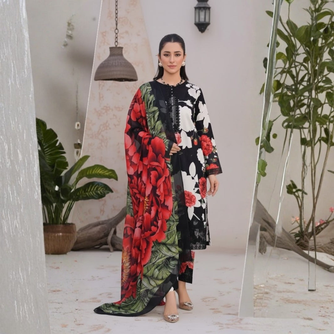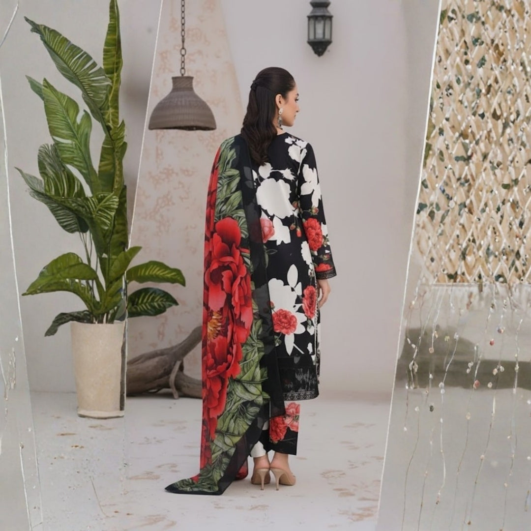 This bold three-piece ensemble features a printed lawn shirt in a striking black and white base, dominated by oversized, vibrant red rose motifs.