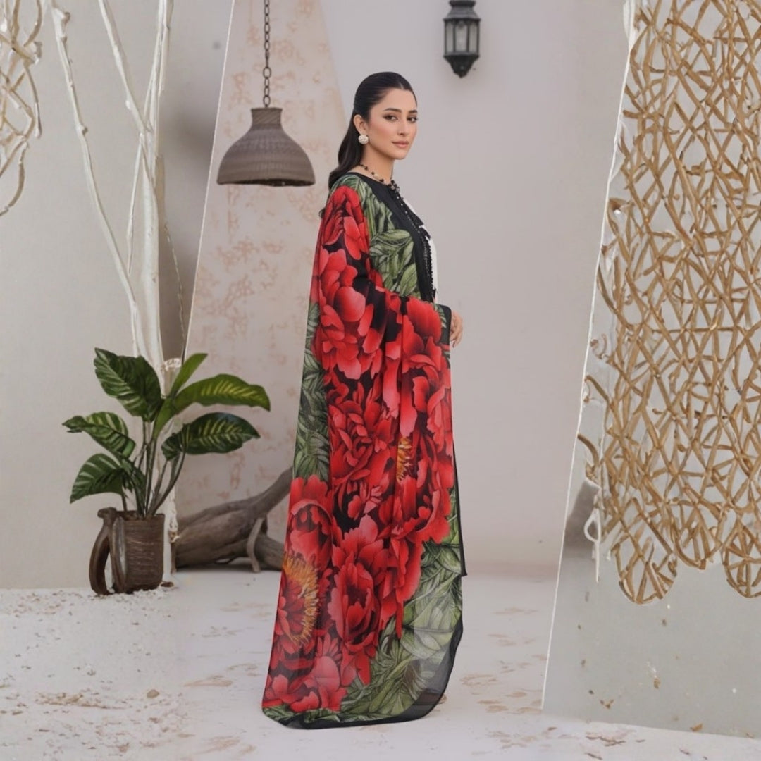 A voluminous chiffon dupatta showcases the same rich botanical artwork, framed by lush green leaves to provide a powerful and balanced finish.