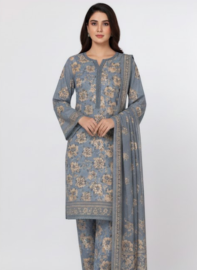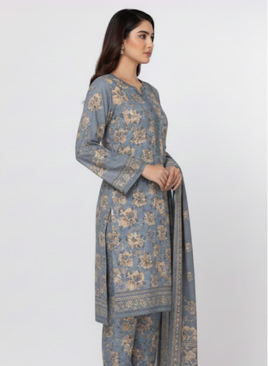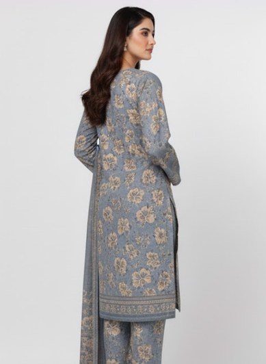 This elegant three-piece ensemble features a muted slate blue base layered with a delicate, vintage-inspired floral print in soft beige and cream tones.