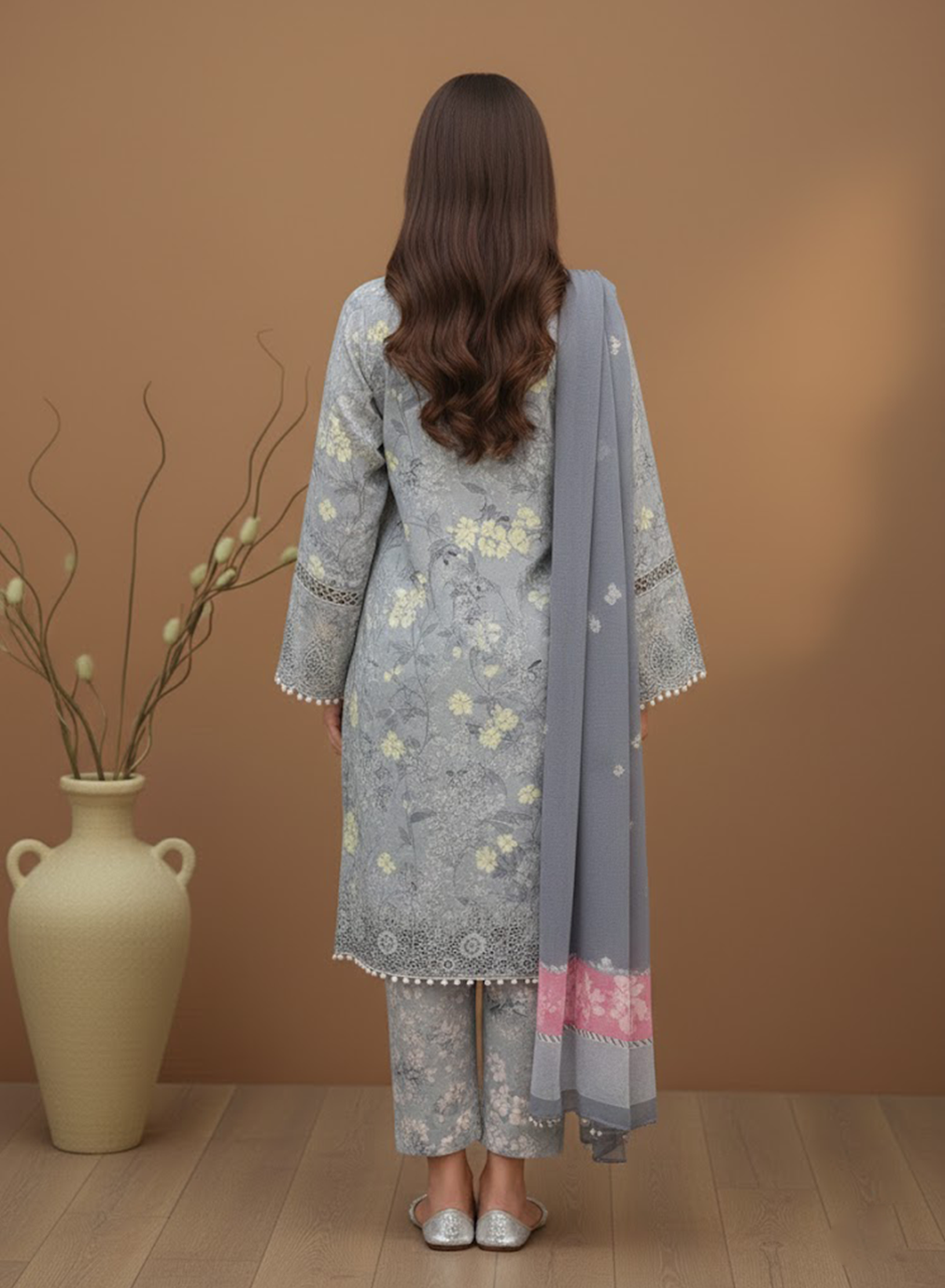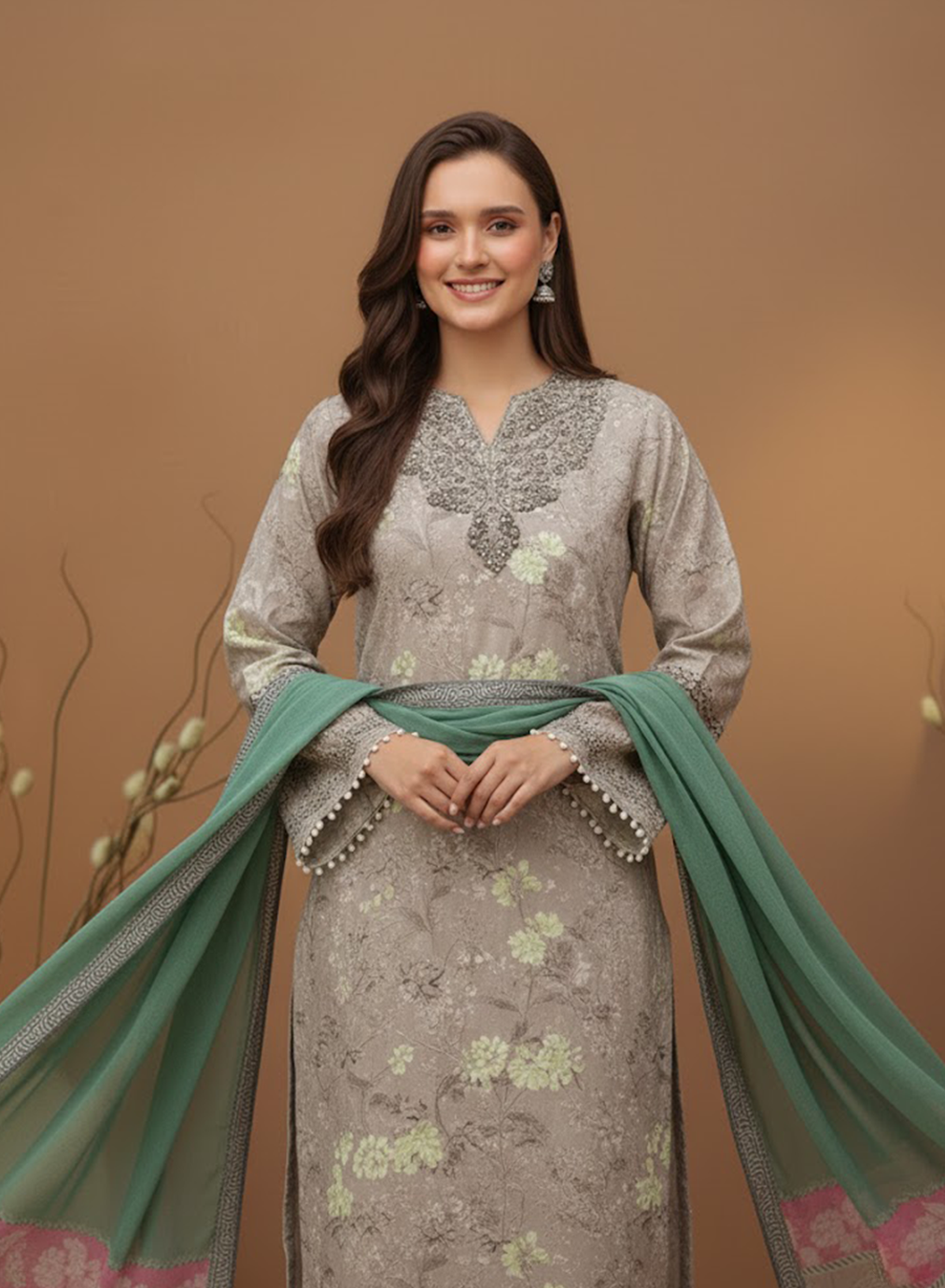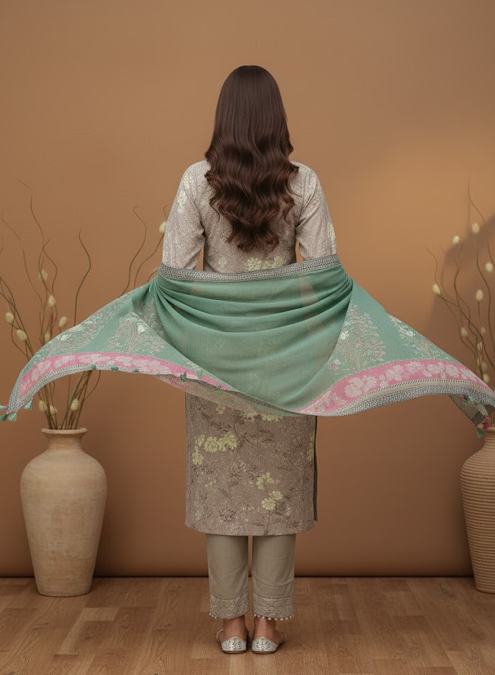 Premium 3-Piece Set: A complete, high-quality outfit featuring a printed shirt, matching printed trousers, and a contrasting dupatta for a fully coordinated look.
