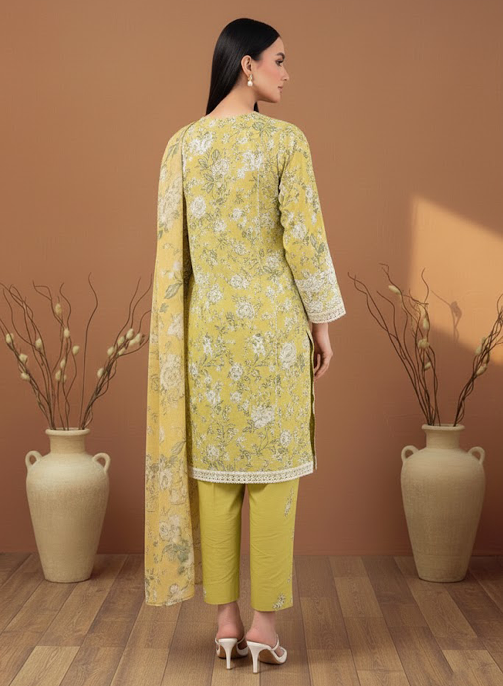 Coordinated 3-piece set: The ensemble is completed with a matching printed lawn dupatta and trousers for a seamless, head-to-toe floral look.