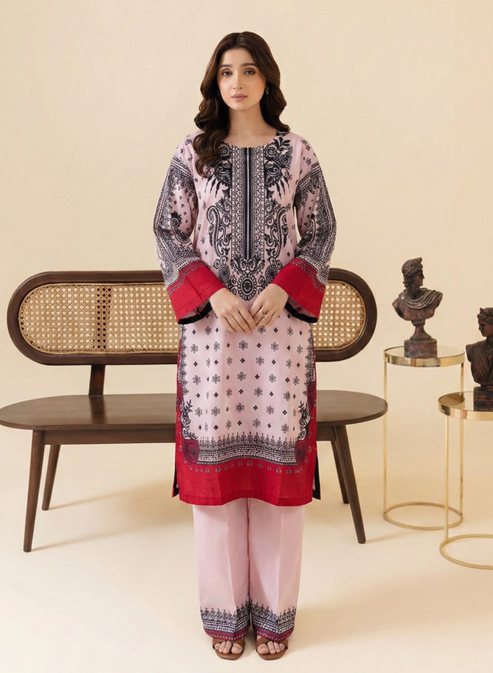 Trousers: Includes matching wide-leg trousers in a coordinated pink shade, featuring a delicate black border at the hem to complete the look.
